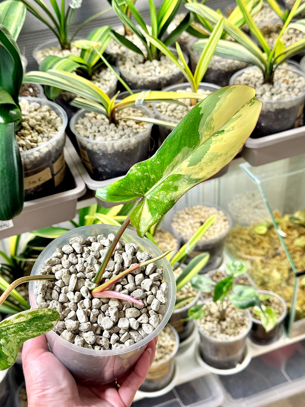 This Philodendron Mayoi Variegata has bright and attractive variegation. The plant currently has four leaves, with a fifth leaf on the way. The newest leaf shows particularly nice variegation.